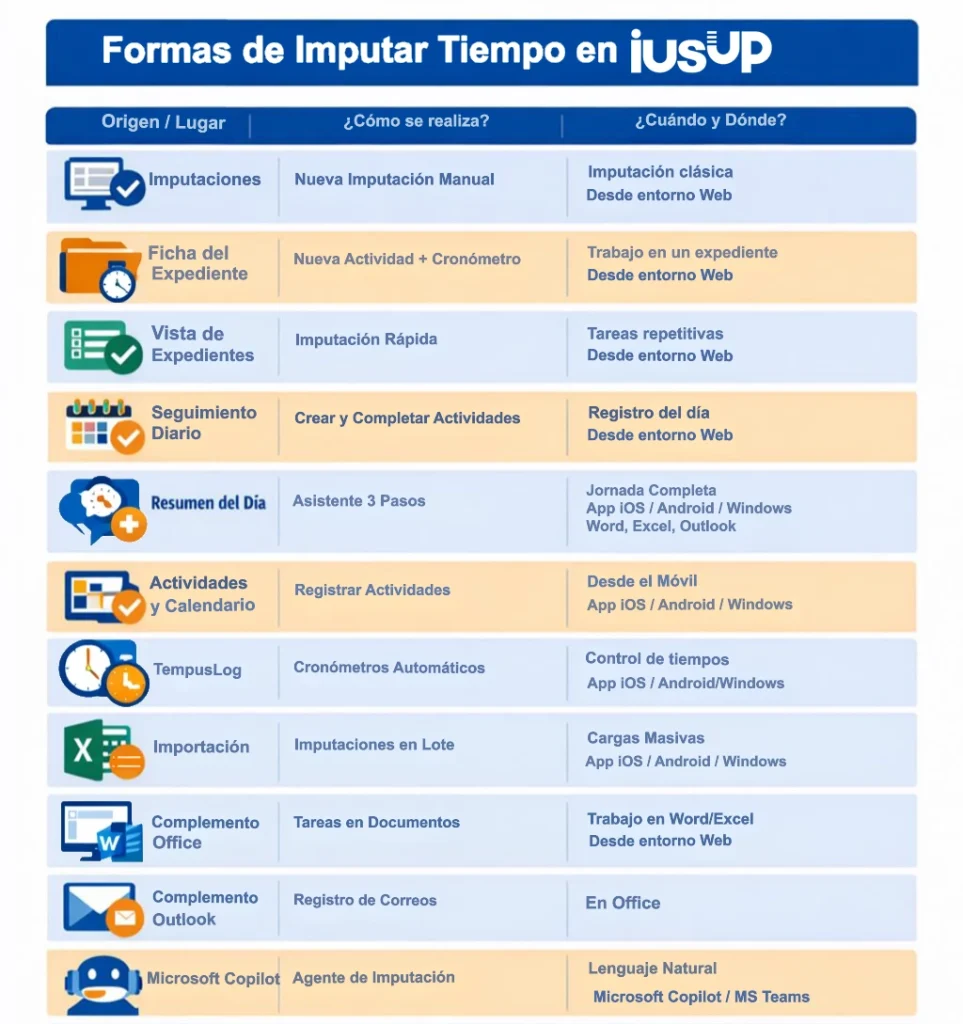 Con iusUp puedes imputar tus horas trabajadas desde la propia interfaz de nuestro software, a través del apartado «Imputaciones». También, desde la ficha del Expediente o la vista del Expediente con el que estés trabajando en ese momento. O, si lo prefieres, desde Seguimiento Diario, mientras repasas las actividades que tienes pendientes de realizar en una fecha concreta o le echas un vistazo a las que ya cerraste en el pasado. Además, cuentas con la funcionalidad Resumen del Día, tanto en la app como en los complementos para Office y Outlook, que te permite hacerlo en un proceso guiado a través de varios pasos. Si lo prefieres, también podrás aprovechar toda la potencia de Copilot. E, incluso, la nueva funcionalidad Tempus Log, que estará en breve disponible en la app. Solo, por citar algunas de las opciones que tienes. Bajo estas líneas puedes ver un gráfico en el que te las mostramos todas, con sus detalles más destacados.